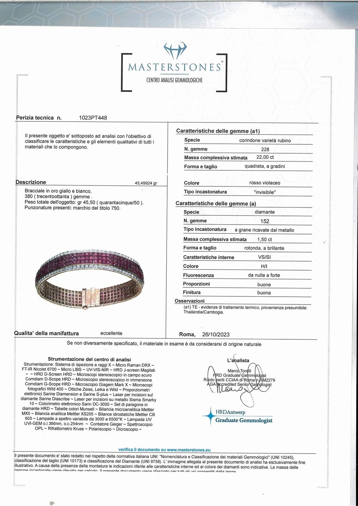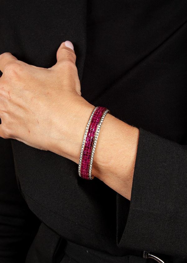 Oro giallo 750/000. Rubini naturali in taglio carré ct. 22 con incastonatura misteriosa, diamanti in taglio rotondo brillante ct. 1,50, H-I, VS-SI. Peso complessivo gr. 45,50. Corredato di certificazione gemmologica.
