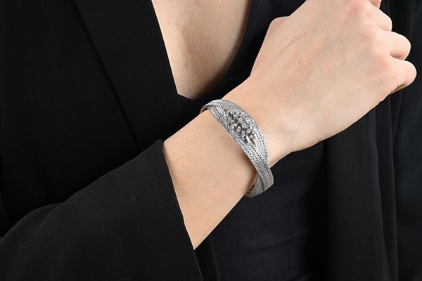 Oro bianco 750/000. Diamanti in taglio rotondo brillante e 8/8 per ct. 0,60. Peso complessivo gr. 49,70. Firmato Uno a erre