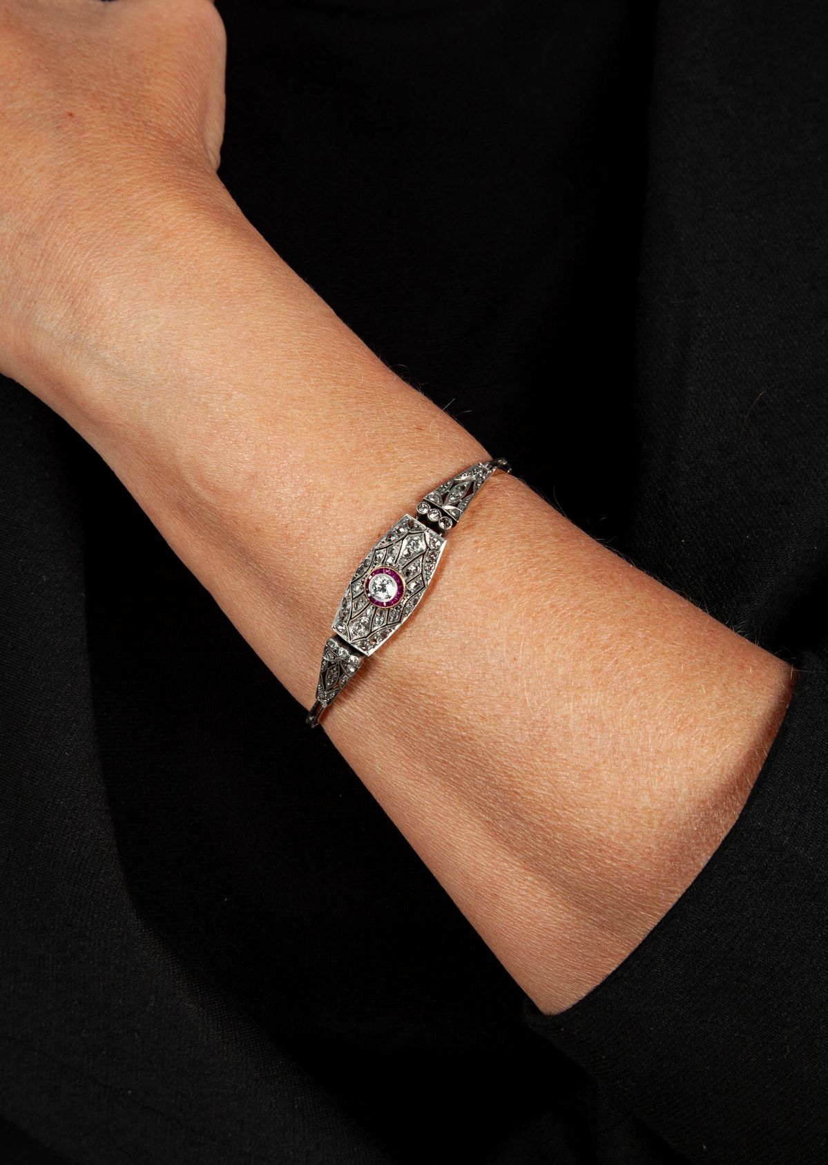 Oro bianco 750/000 e platino. Diamanti in taglio rotondo antico e taglio rosa, rubini in taglio carrè. Peso complessivo gr. 11,70