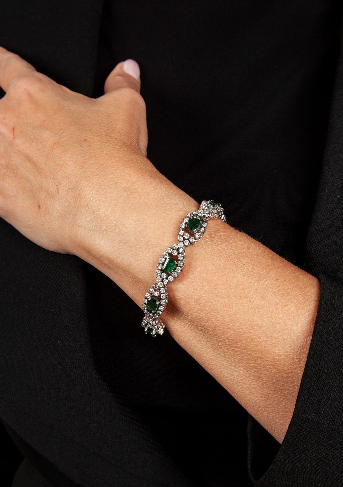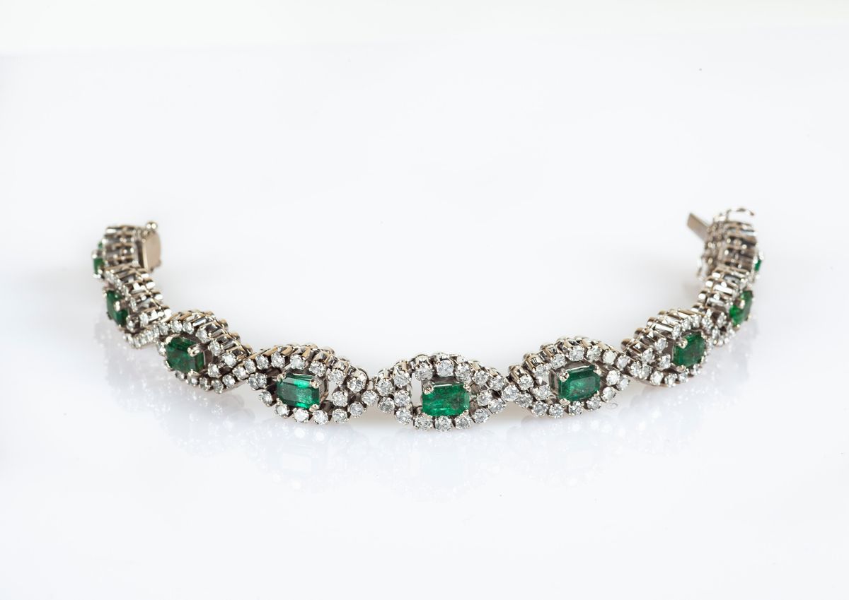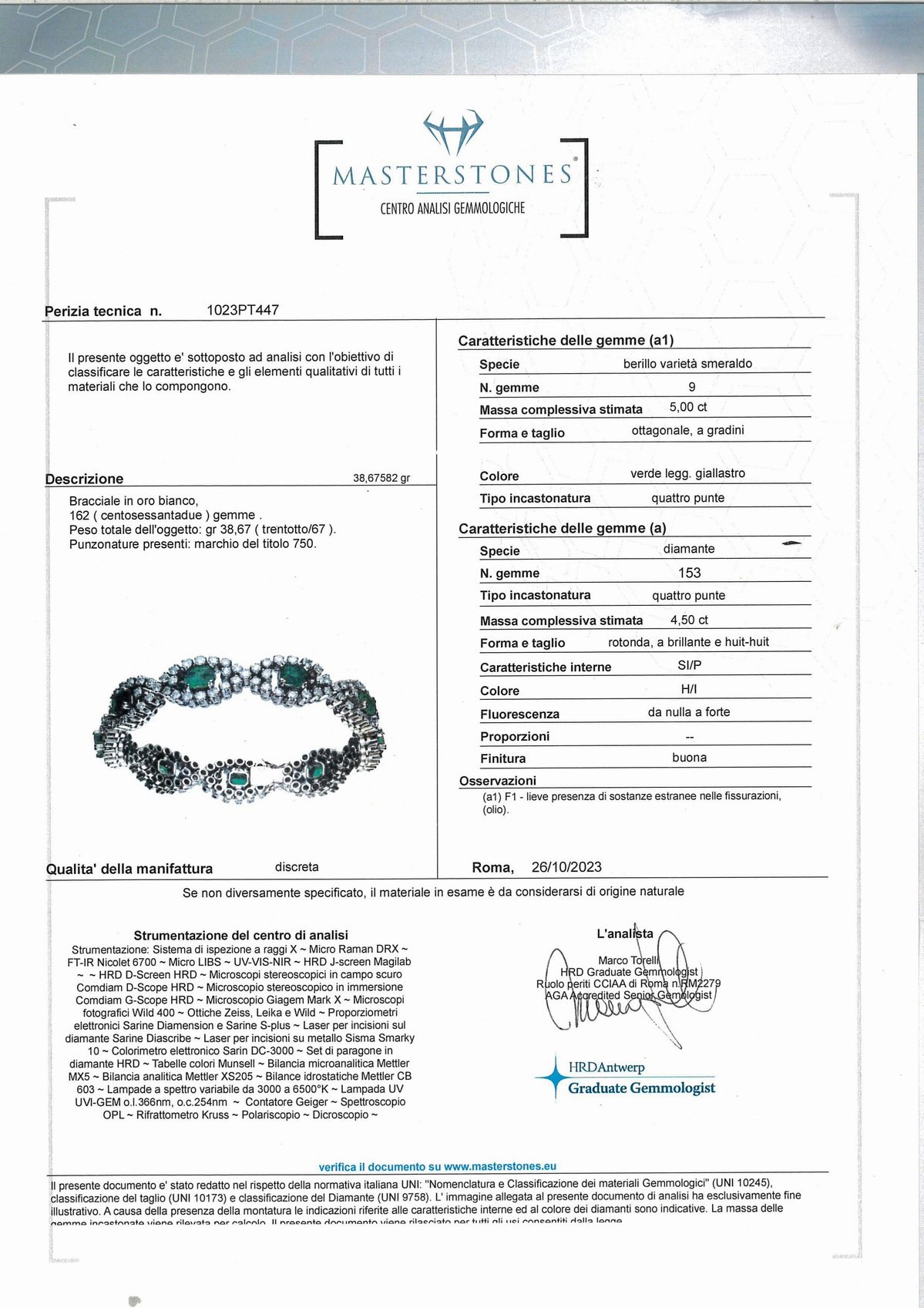 Oro bianco 750/000. Smeraldi naturali in taglio a gradini ct. 5. Diamanti in taglio rotondo ct. 4,50, H-I, SI-P. Peso complessivo gr. 38,70. Corredato da certificazione gemmologica.