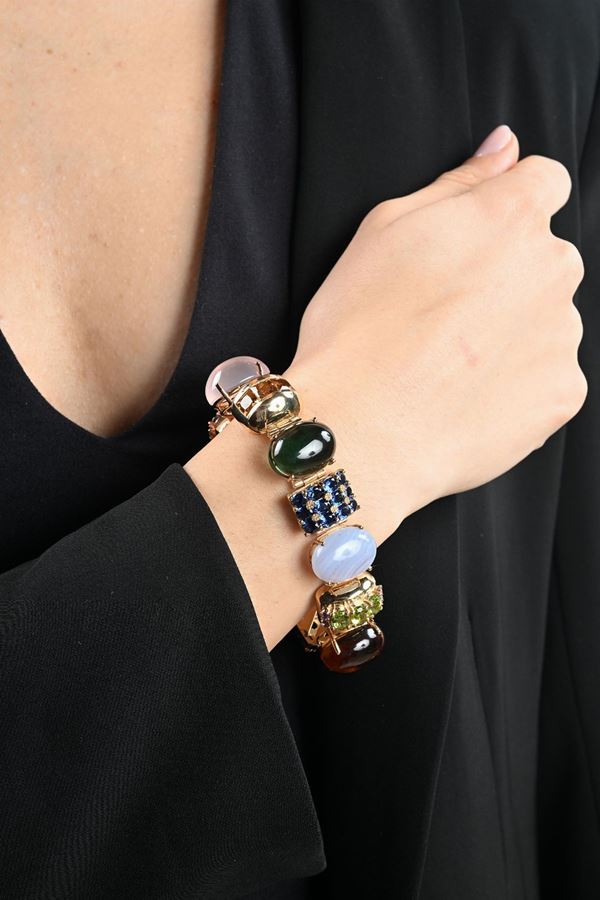 Oro giallo 585/000. Diamanti in taglio rotondo brillante, zaffiri, rubini ametiste, peridoti in taglio ovale. Ametista, quarzi, calcedonio in taglio cabochon. Peso complessivo gr. 73.