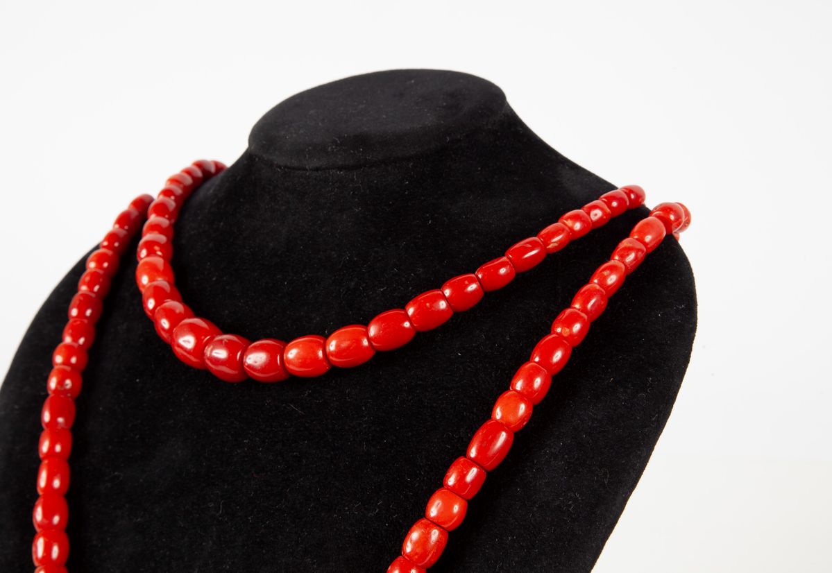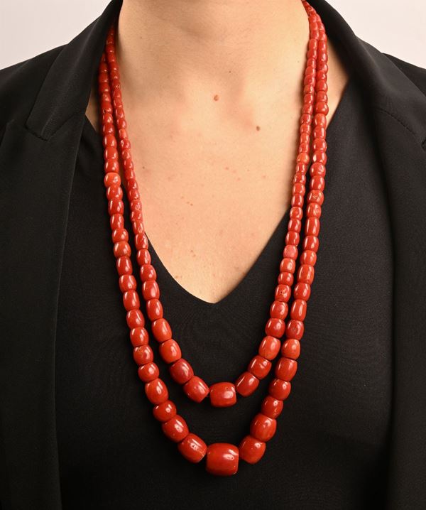 Corallo rosso in taglio barilotto da mm. 6 a mm. 18, chiusura in oro giallo 750/000. Peso complessivo gr. 181,50