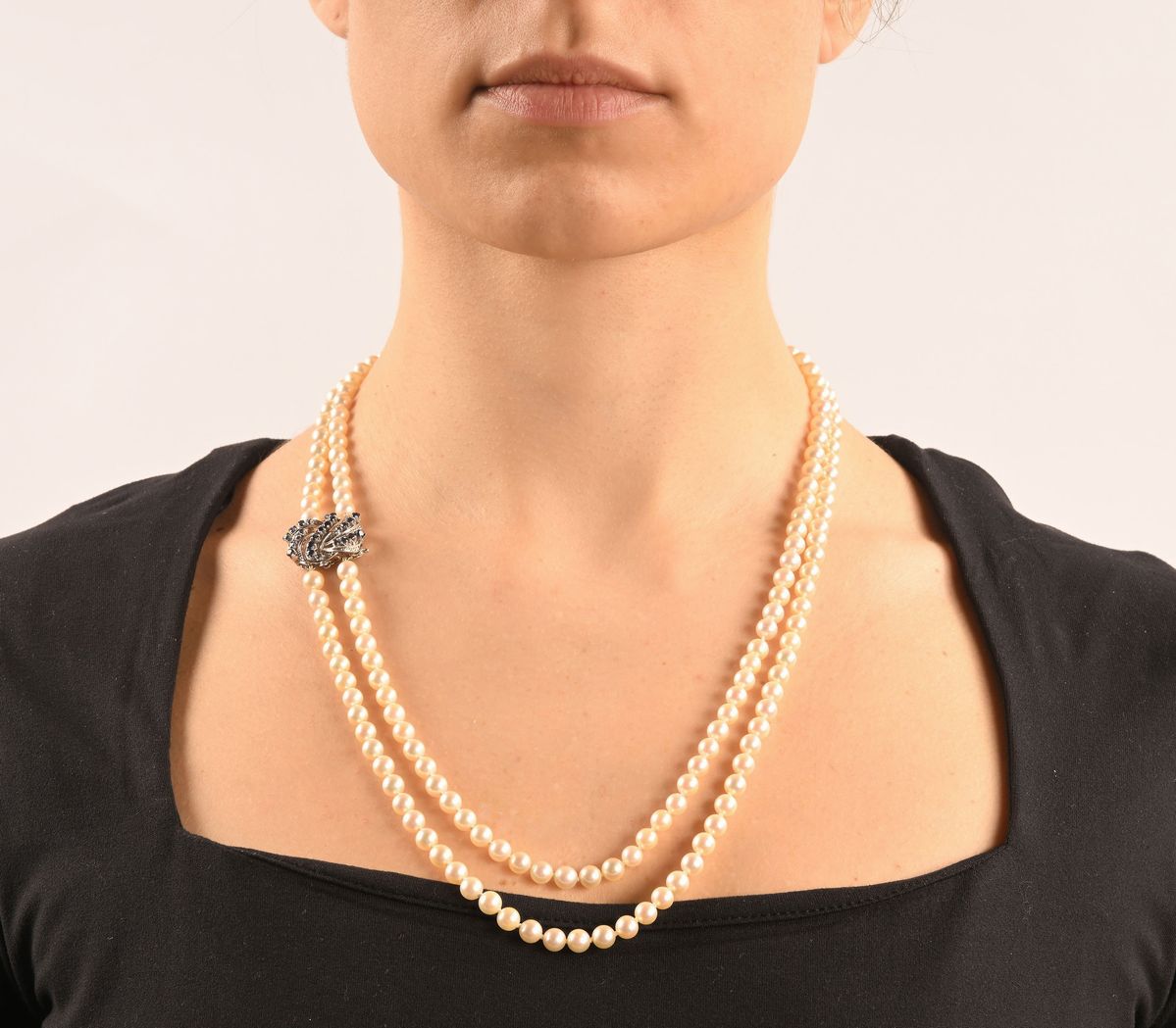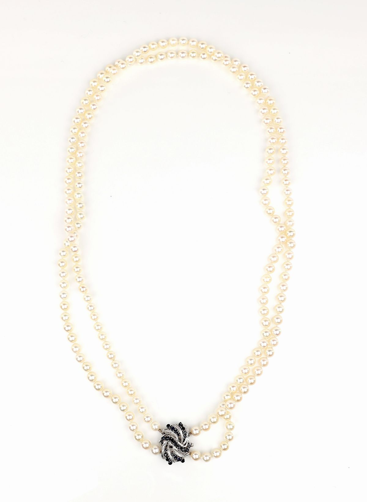 Collana a due fili di perle con chiusura in oro e zaffiri