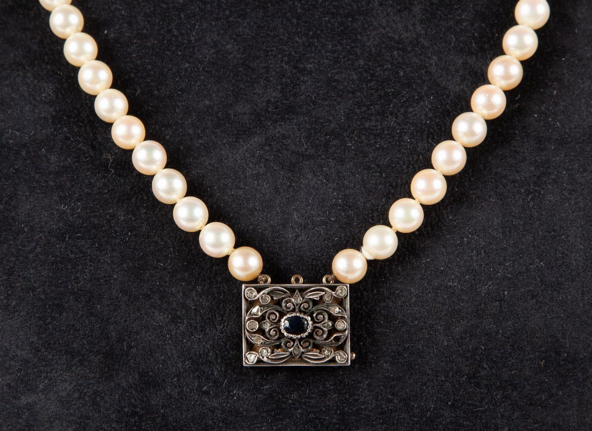 Collana di perle con fermezza in oro e argento, diamanti e zaffiro