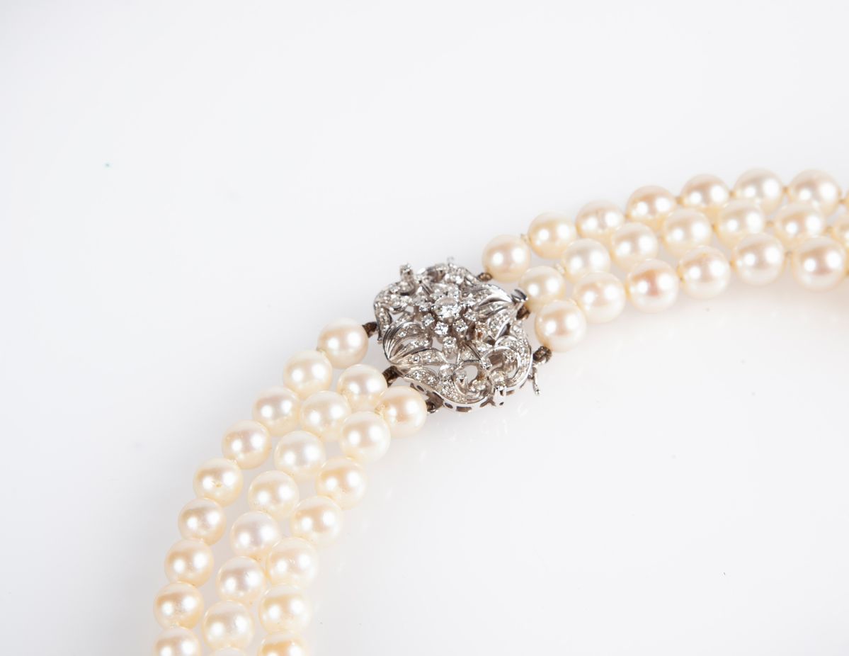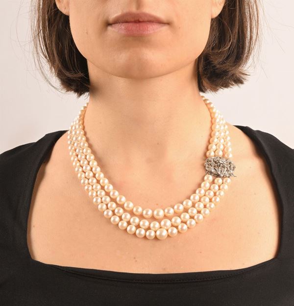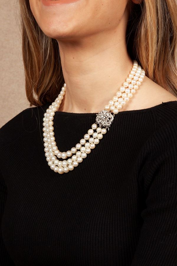 Oro bianco 750/000, diamanti in taglio rotondo e huit-huit. Perle da coltivazione in acqua marina ,diametro da mm. 6 1/2 a mm 9 1/2. Peso complessivo gr. 123.