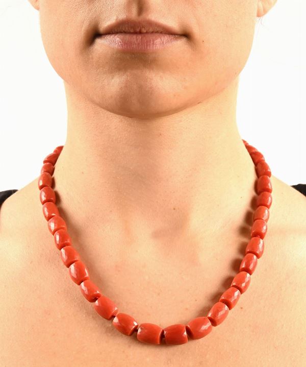 Corallo rosso in taglio barilotto da mm. 7 a mm. 12. Chiusura in argento e corallo. Peso complessivo gr. 70,40