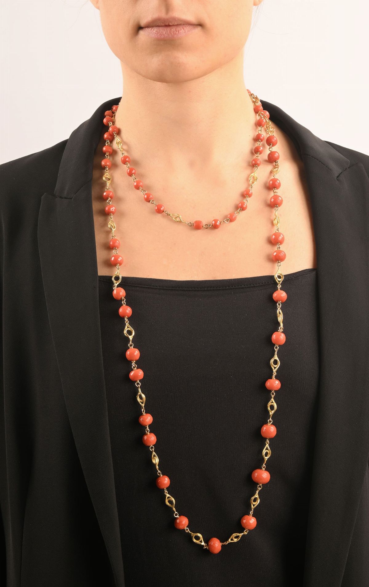 Oro giallo 750/000. Corallo rosso da mm 8 a mm. 15. Peso complessivo gr. 139,5