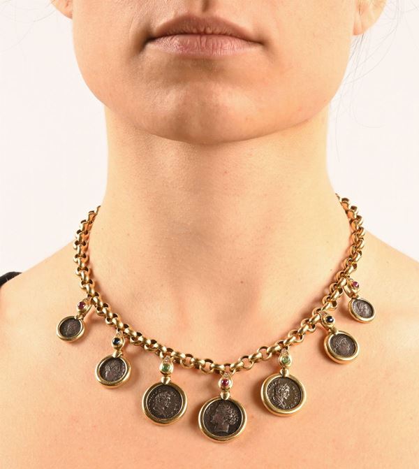 Collana in oro, monete, zaffiri, smeraldi e rubini cabochon e brillanti