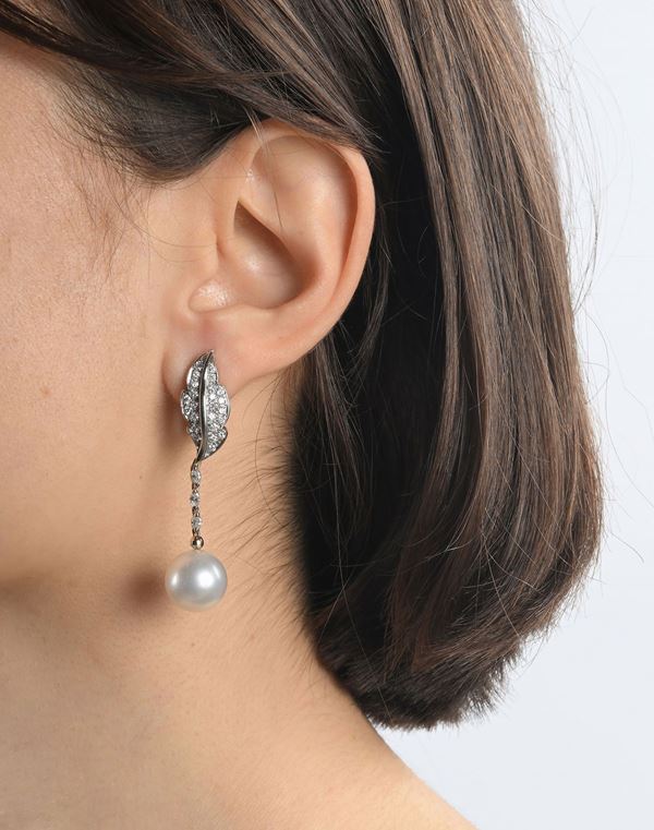 Oro bianco 750/000. Diamanti in taglio rotondo brillanti ct. 1,40 ca. Perle naturali dei Mari del Sud mm. 13. Peso complessivo gr. 17,80