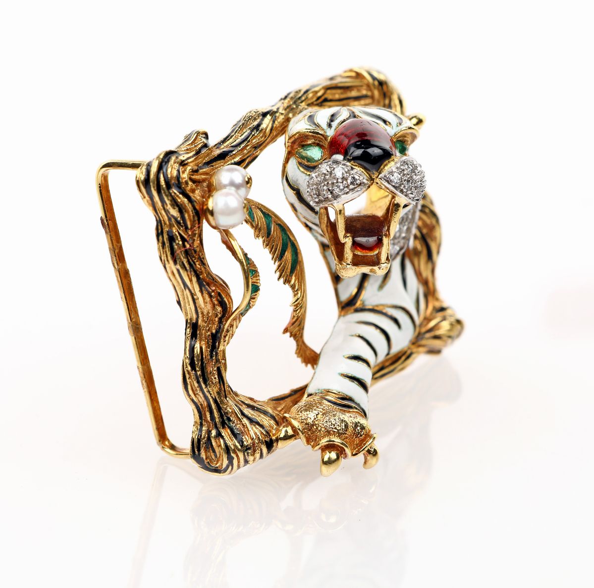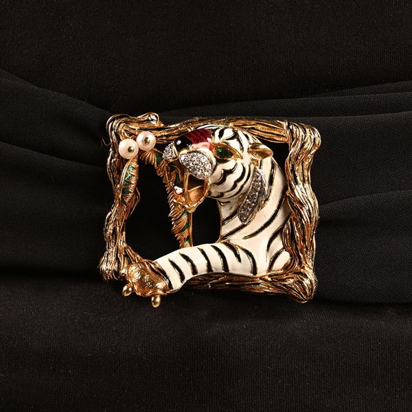 Frascarolo, fibbia tigre bianca in oro, diamanti, smeraldi e smalti.