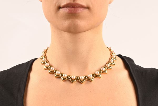 Oro giallo 750/000. Perle naturali da coltivazione in acquamarina. Diametro 8 mm. Peco complessivo gr 123