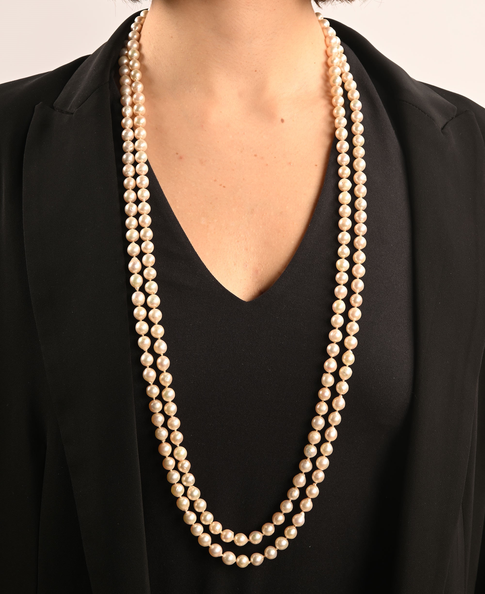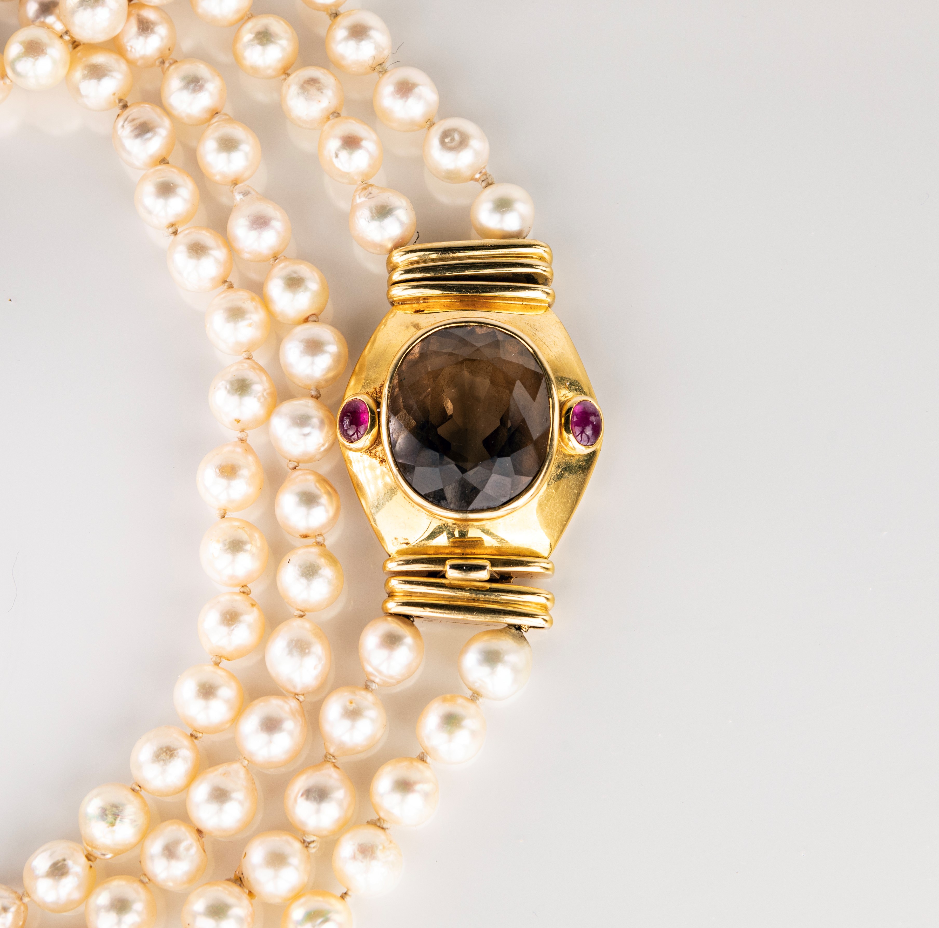 Lunga collana di perle a due fili con chiusura in oro, topazio e rubini