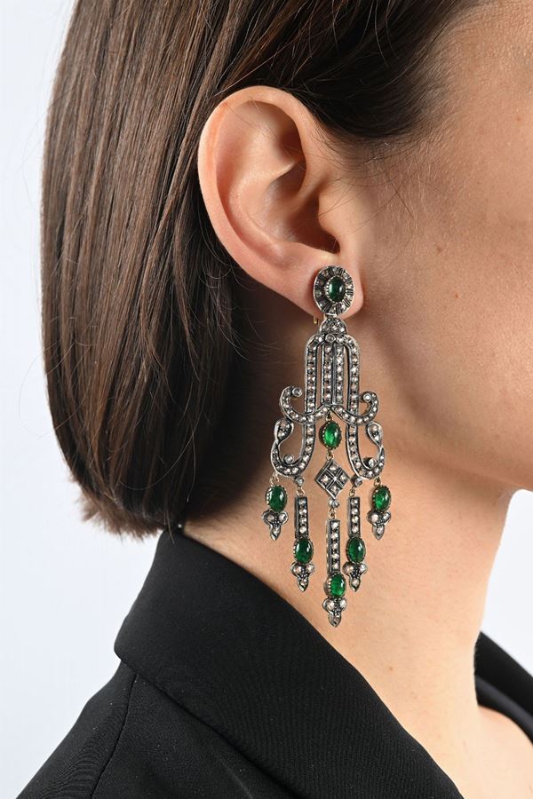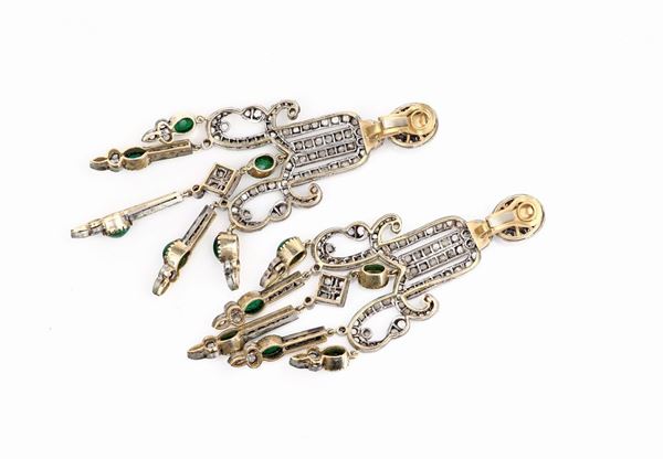 Oro a basso titolo, argento, diamanti in taglio rosa e smeraldi in taglio cabochon. Peso complessivo gr. 42,90