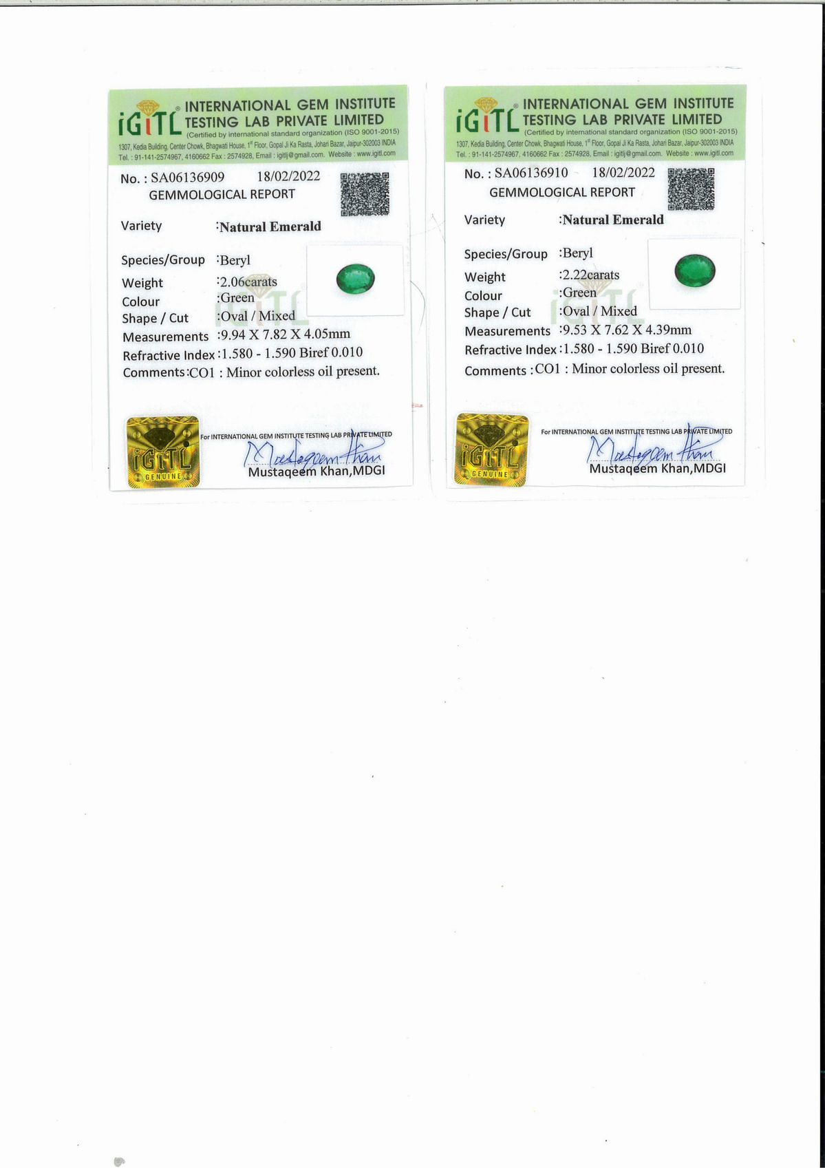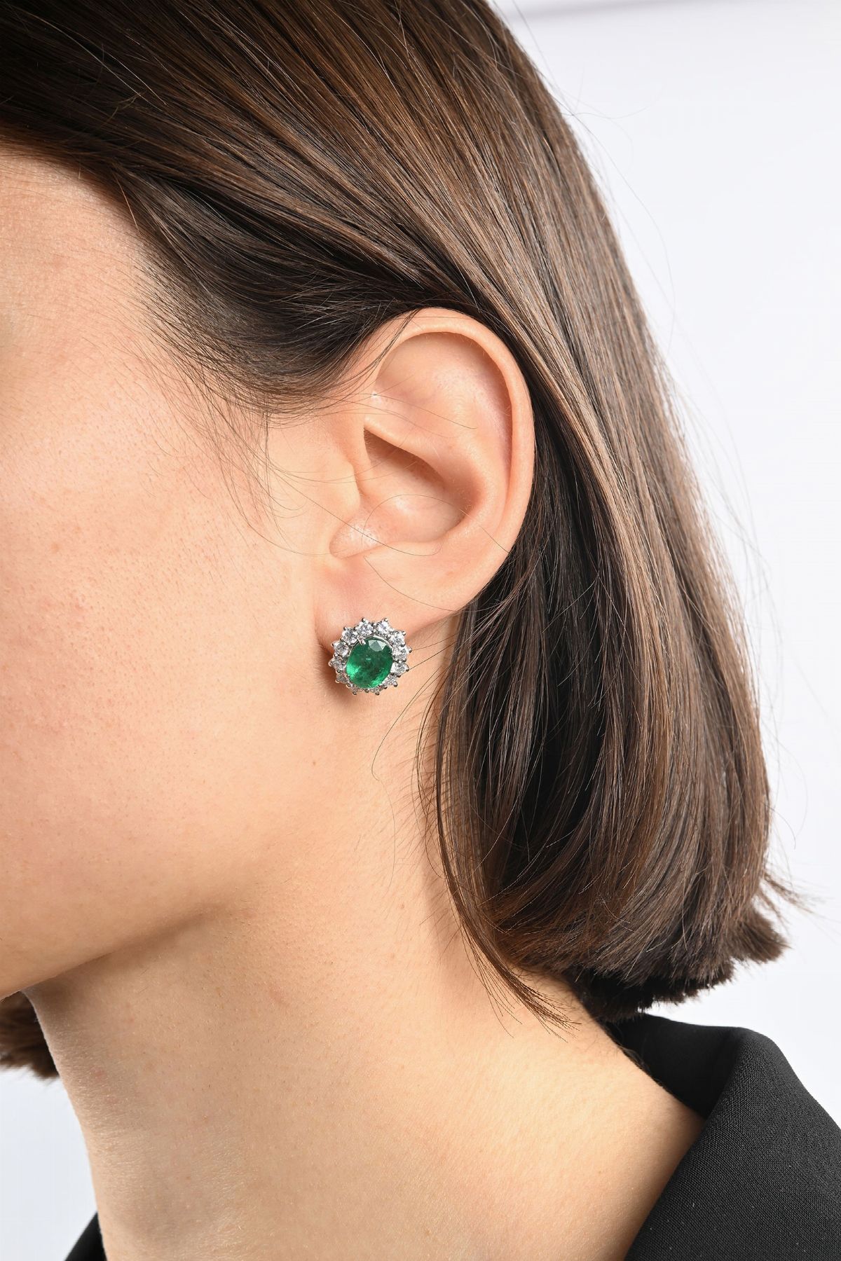 Oro bianco 750/000. Smeraldi in taglio ovale ct. 4,28, diamanti in taglio rotondo brillante ct. 2,10 ca. prob F-G VS. Peso complessivo gr. 6. Corredati di certificazione gemmologica.