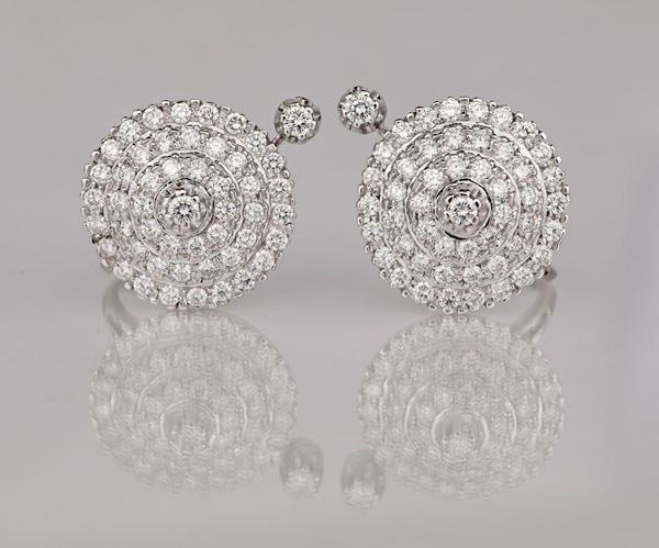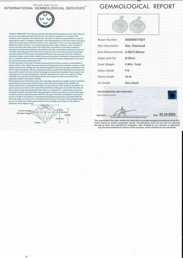 Oro bianco 750/000. Diamanti in taglio rotondo brillante ct. 3,90, F-G, VS- SI. Peso complessivo gr. 12. Corredati di certificazione gemmlogica