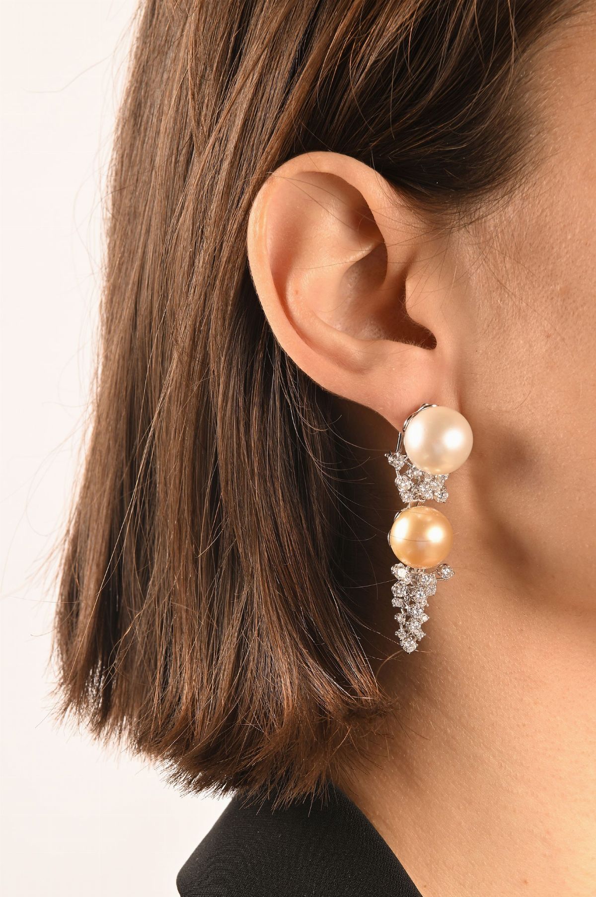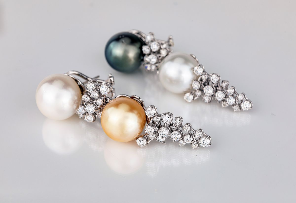 Oro bianco 750/000. Diamanti in a taglio rotondo brillante ct. 2,60 ca., G-H, VS. Perle bianche, Tahiti e golden mm. 13/14. Peso complessivo gr. 30,10.