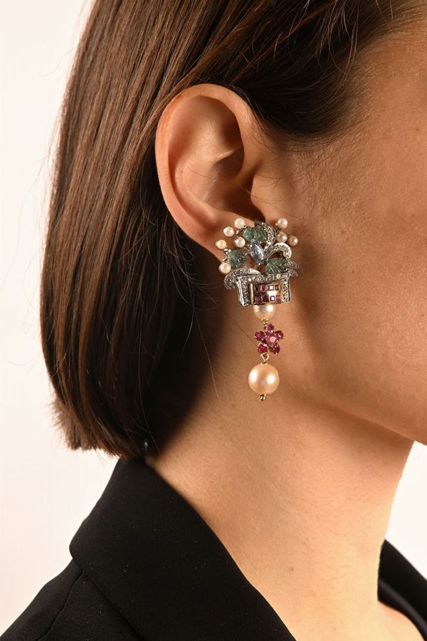 Orecchini pendenti tipo tuttifrutti in oro, argento, pietre preziose e perle