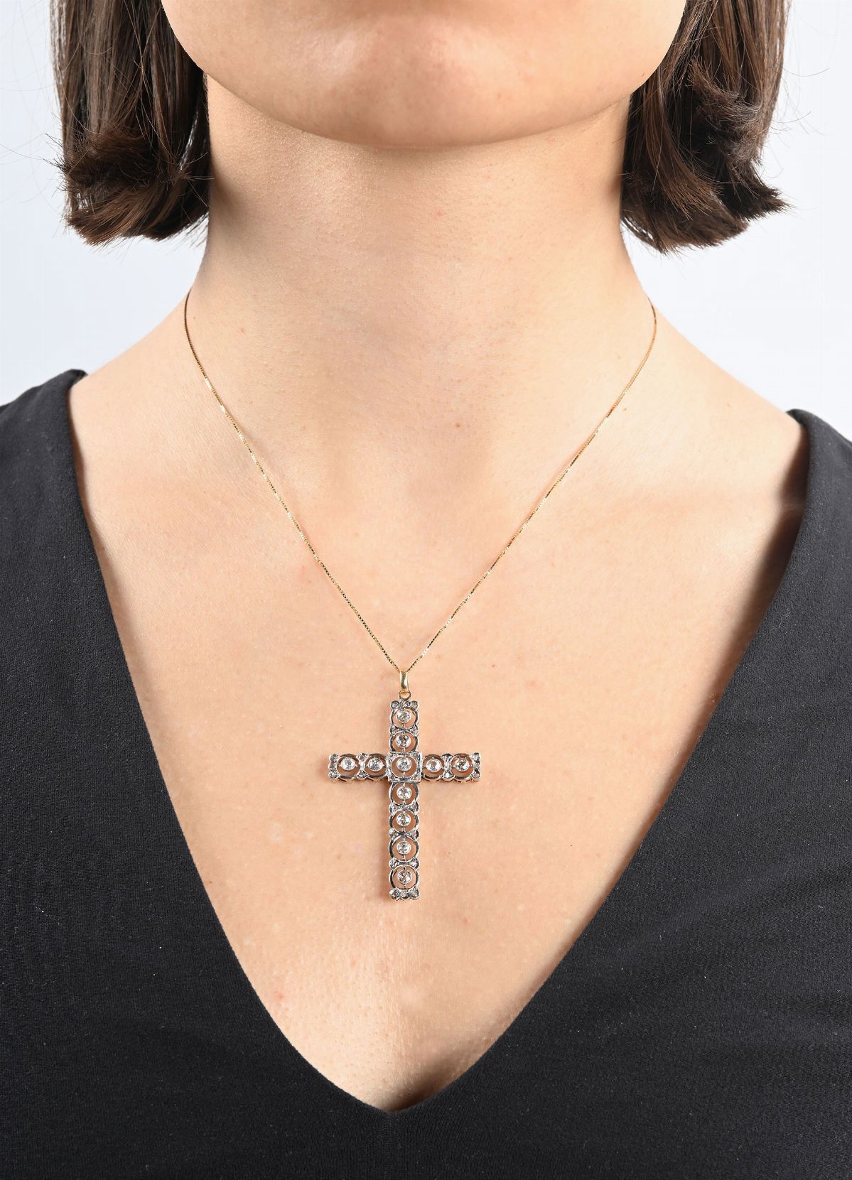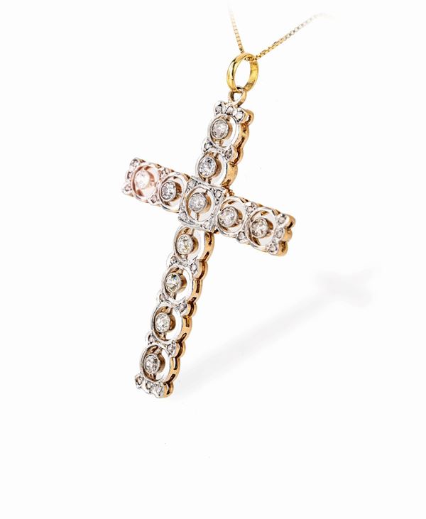Oro giallo 750/000. Diamanti in taglio vecchia Europa ct. 1,00 ca. Peso complessivo gr. 7,70