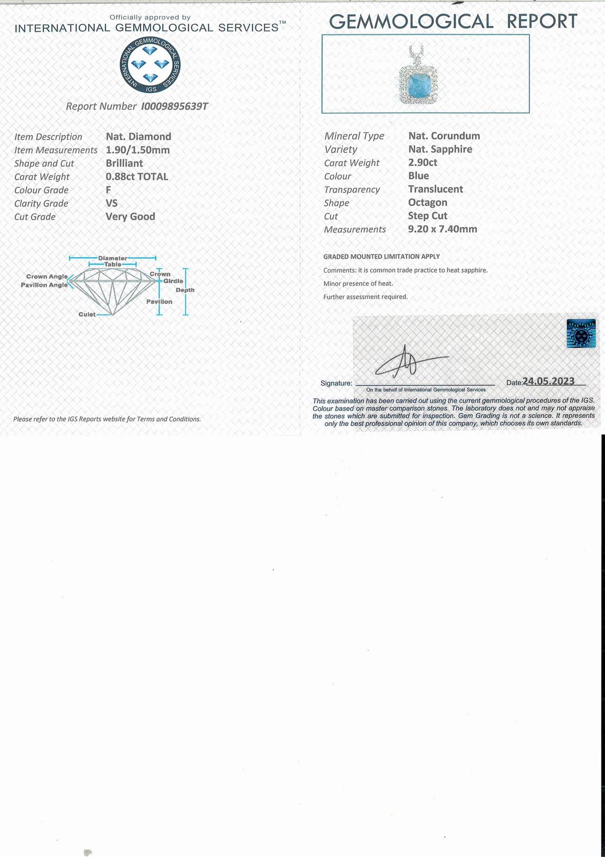 Oro bianco 750/000. Diamanti in taglio rotondo brillante ct. 0,88 F VS, Zaffiro ct. 2,90. Peso complessivo gr. 5,40. Corredato di certificazione gemmologica.