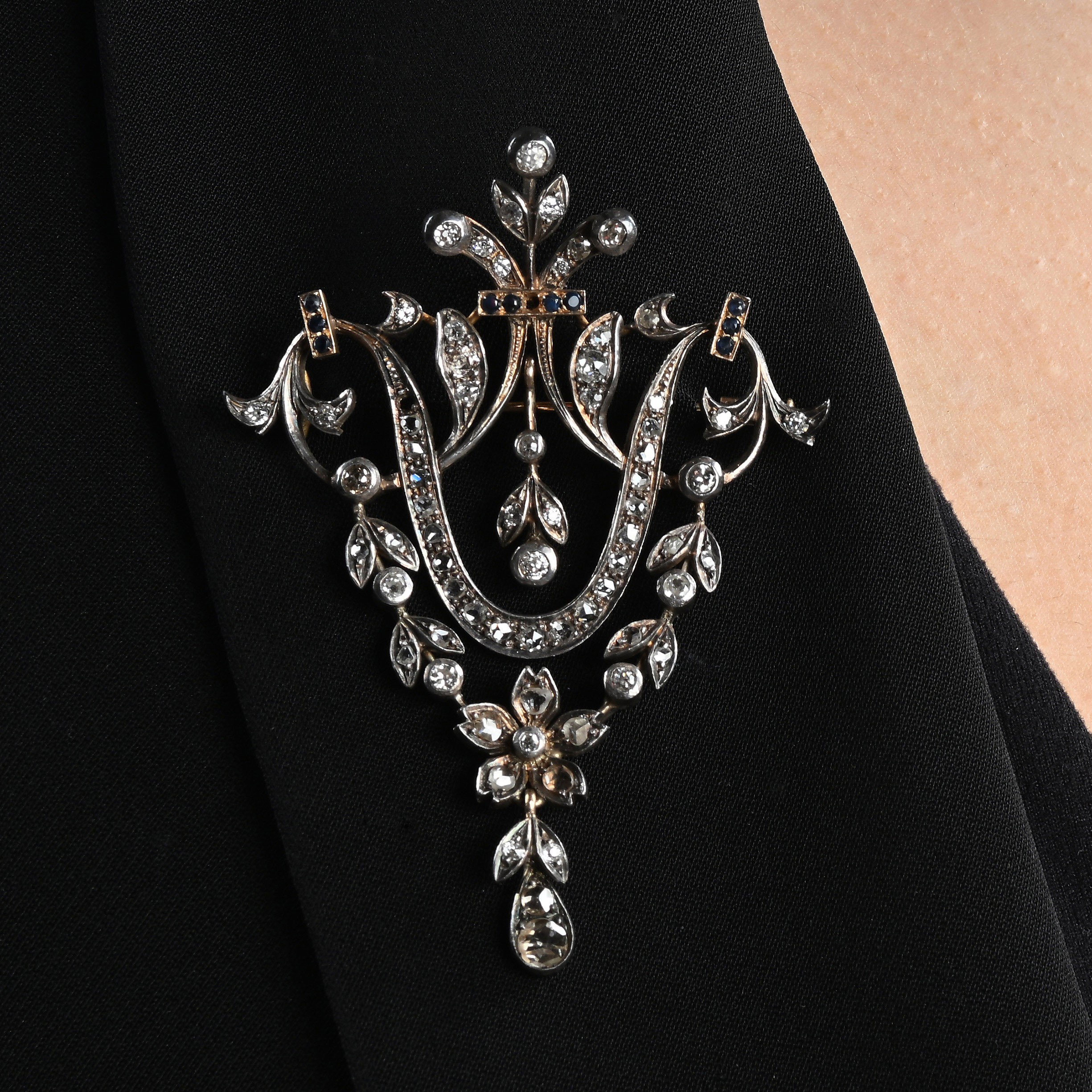 Oro a basso titolo e argento. Diamanti in taglio antico e taglio rosa e zaffiri. Peso complessivo gr. 18,90.