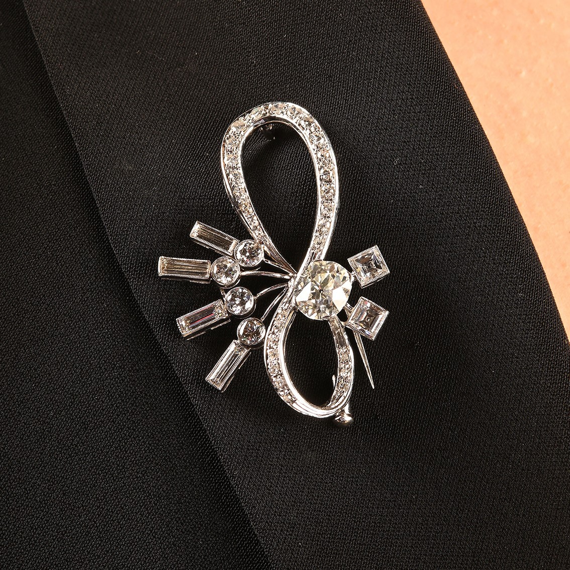 Oro bianco 750/000. Diamante centrale taglio antico ct. 2,50 ca. e diamanti in taglio rotondo, baguettes e carrè per ct. 2 ca. Peso complessivo gr. 8,90