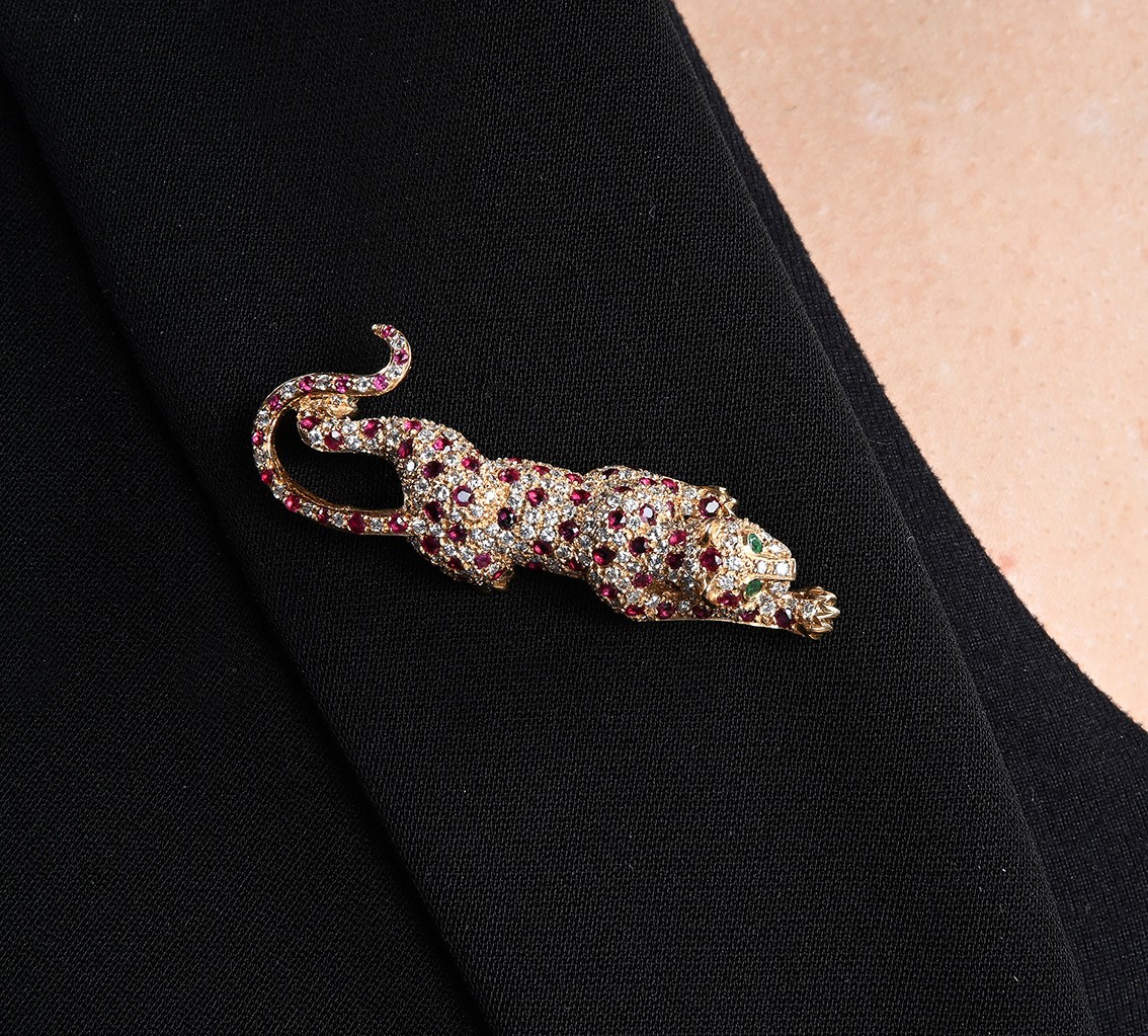 Spilla pantera in oro brillanti e rubini