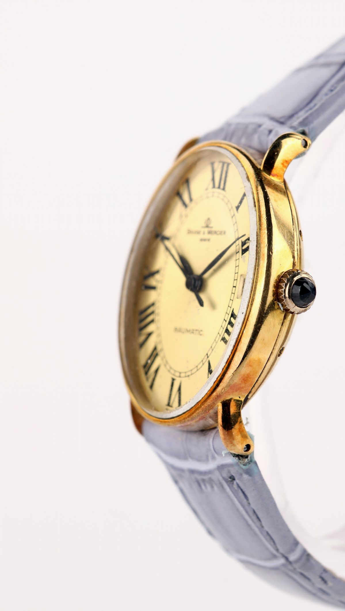 Oro giallo 750/000. Cassa n° 389597, ref. 37067, corona con cabochon, fondello con viti. Quadrante dorato, numeri romani, data, lancette a foglia, secondi al centro. Movimento automatico, dorato, bilanciere monometalico, spirale piana.