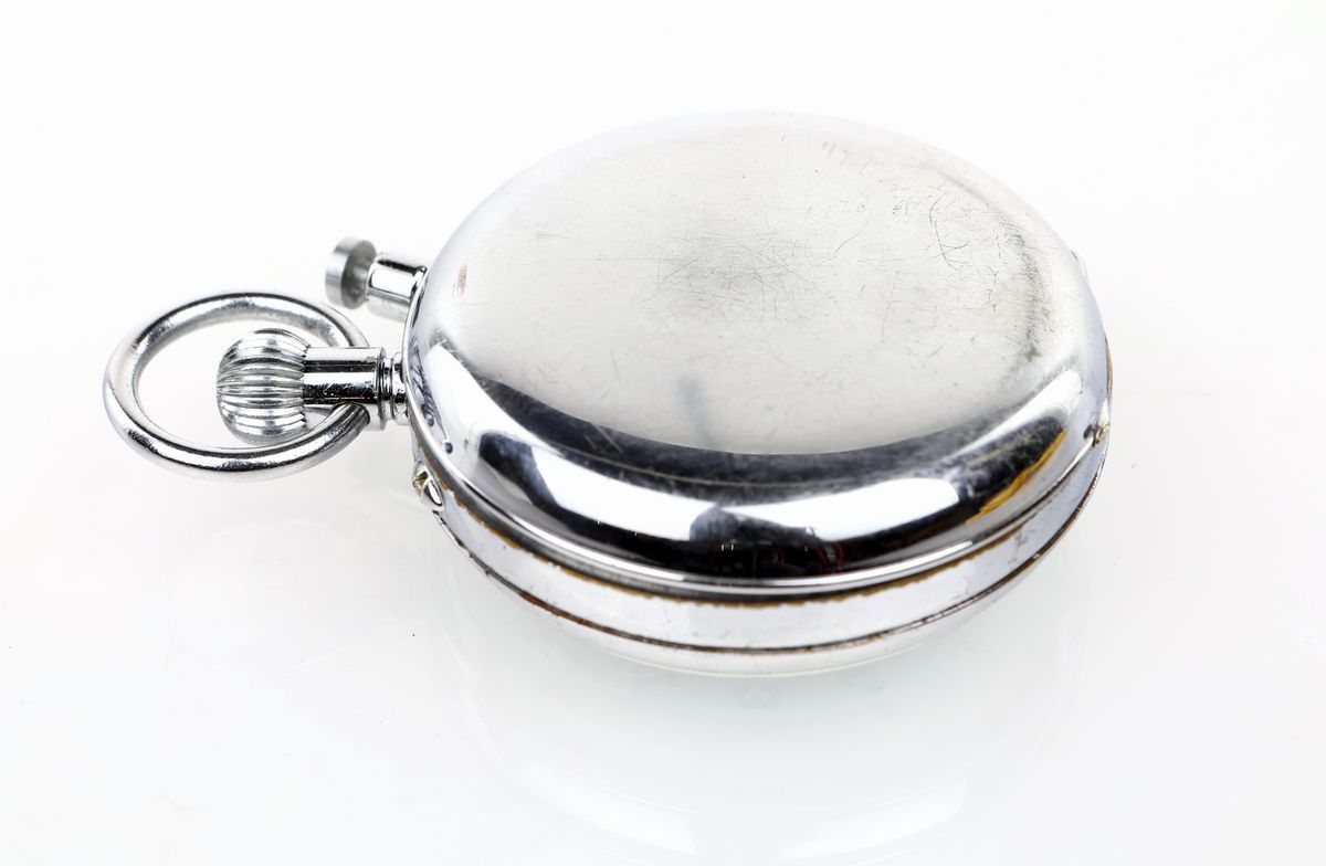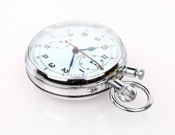 Cassa in metallo cromato, avvio del cronografo tramite la corona e rattrappante tramite pulsante ad ore 11. Quadrante bianco, numeri arabi, quadrantino dei secondi e del sommatore dei minuti, lancette a pera. Movimento a remontoire, dorato, cal. LWO 1130, n° 345802, scappamento ad ancora, bilanciere bimetalico con viti, spirale Breguet, ruota a colonne.