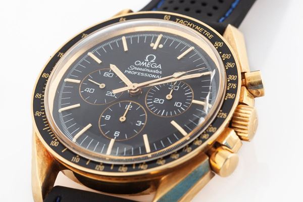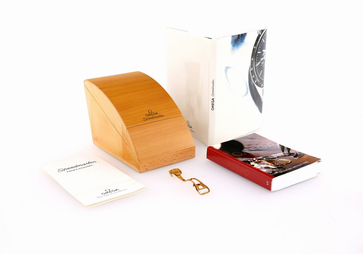 Accessori: astuccio in legno, scatola esterna, libretti, astuccio scamosciato da viaggio, libro di Omega, in tiratura limitata.