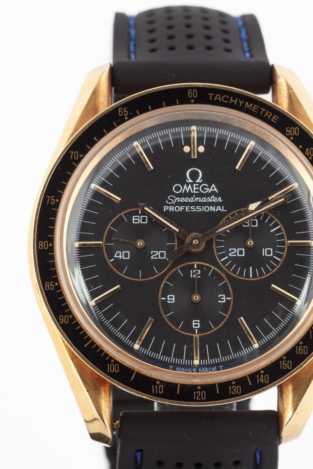 Oro giallo 750/000. Cronografo in serie limitata 249/999, ref 145.00.52. Cassa n° 48304127, lunetta con inserto nero graduato fino a 500 unità, pulsanti tondi, vetro zaffiro, fondello a vite, con ippocampo e iscrizione: The first watch wron on the moon.