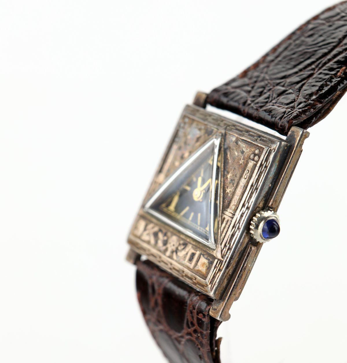 Argento 800/000. Cassa decorata con motivi massonici, corona con cabochon, fondello a scatto. Quadrante triangolare nero, indice e lancette a bastone. Movimento manuale, cal. Peseux, bilanciere monometalico con viti, spirale piana.