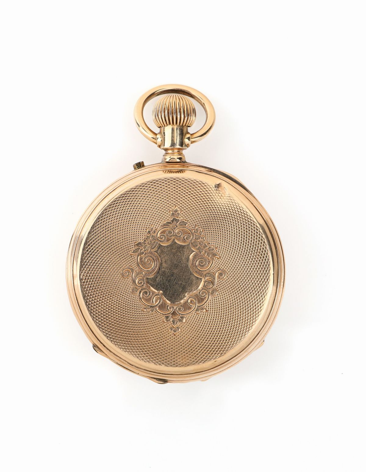 Oro giallo 585/000. Remontoir, cassa a 4 corpi n° 817008, cuvette in metallo dorato, fondello a guilloché con scudo al centro decorato a volute,. Quadrante in smalto bianco, numeri romani, secondi in basso, lancette Luigi XVI. Movimento con scappamentoad ancora, bilanciere bimetalico con viti, spirale piana. Da revisionare
