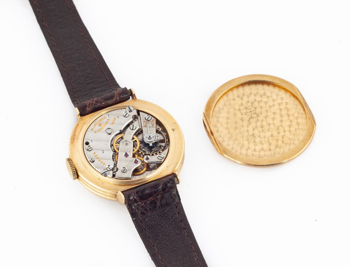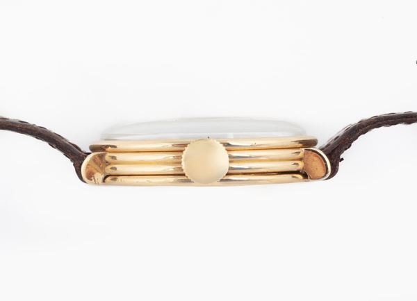 Oro giallo 750/000. Cassa n° 267380 con carrure scanalata, fondello a scatto. Quadrante argentato, indici stampati, secondi in basso, lancette a bastone, movimento manuale n° 423652. BIlanciere bimetalico con viti, spirale Breguet.