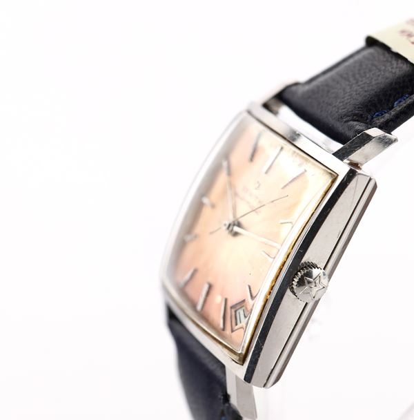 Acciaio. Cassa n° 020A322, fondello a scatto. Quadrante argentato, indici applicati, data, secondi al centro. Movimento automatico, cal 2532, n° 5689053, bilanciere monometalico, spirale piana.