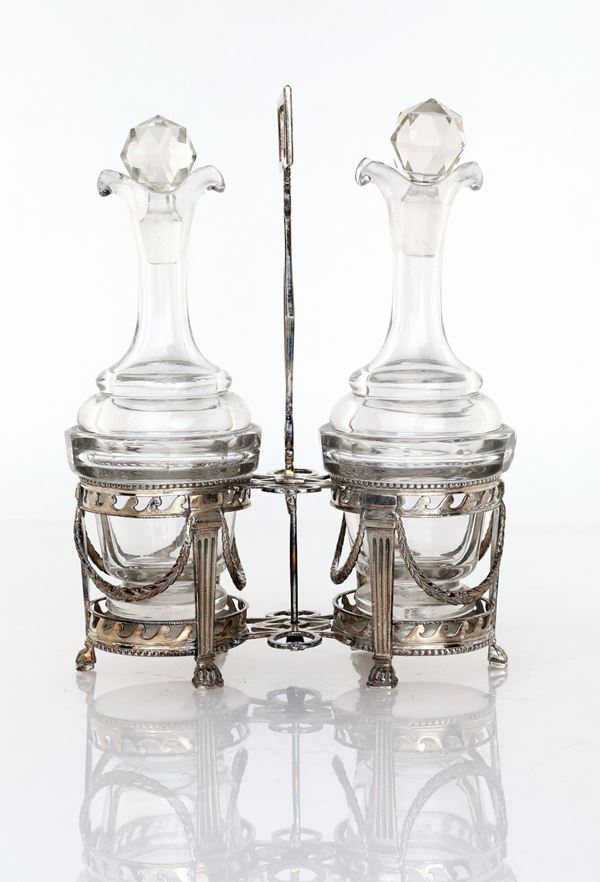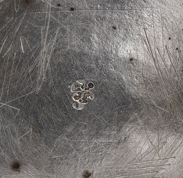 presa centrale traforata costituita da motivi geometrici, alloggi cilindrici definiti da anelli con fascia traforata ad onde e orli perlinati, sostenuti da lesene scanalate riunite da ghirlande vegetali, piedi ferini. Bolli consunti