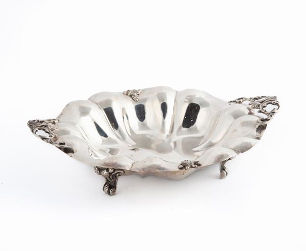vaschetta ondulata impreziosita da rilievi vegetali applicati, sorretta da tre piedi a mensola