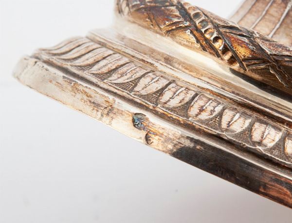 portacandela in forma di vaso classico con festoni fioriti, palmette e cordolo inciso; piede circolare con decorazione martellata ed incisa.