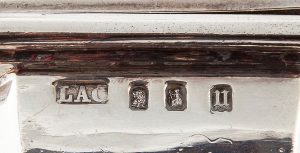 a forma di vaso squadrato con orlo gradinato e angoli concavi; la mostardiera, con vaschetta interna in vetro, manico arcuato e coperchio a cupola incernierato, sormontato da un pinnacolo