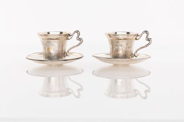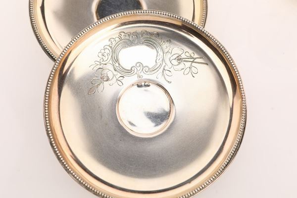 a forma di campana con superficie satinata centrata da medaglione racchiuso da un cartiglio affiancato da fiori incisi, motivo decorativo ripreso sul piatto con orlo perlinato; manici sagomati "a colpo di frusta"