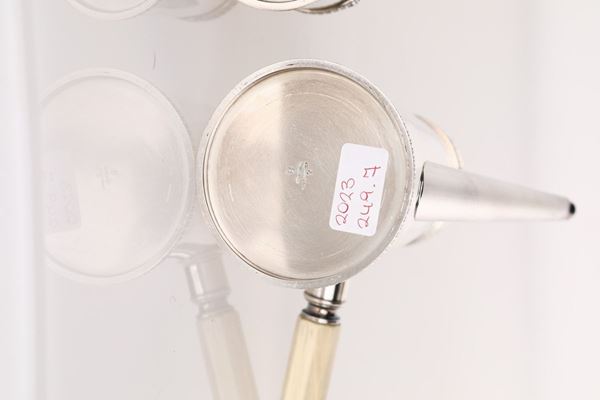 corpo a tronco di cono con versatoio cilindrico e manico traverso in osso; profili dentellati