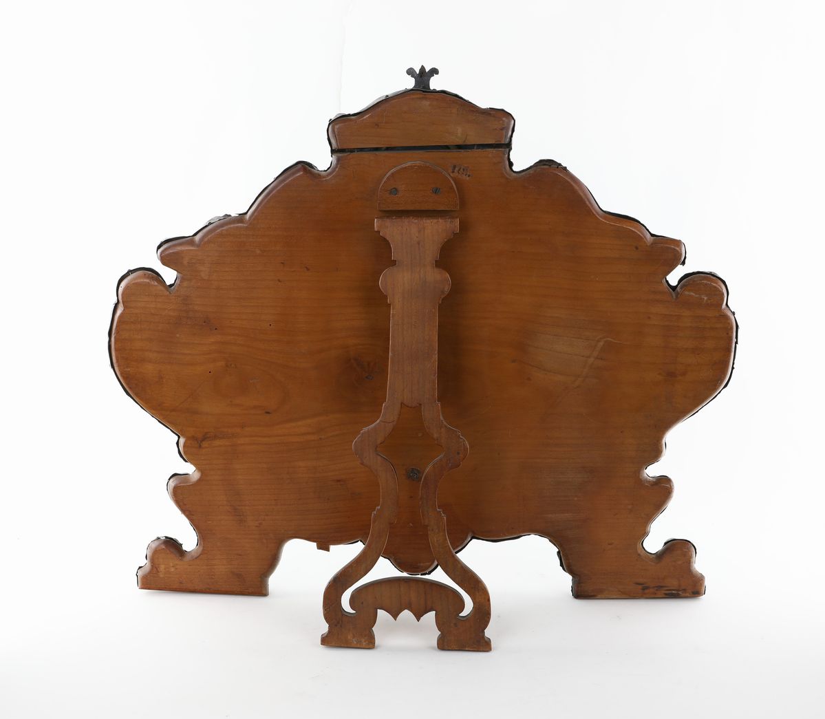 con tabella sagomata racchiusa da cornici modanate spezzate simmetricamente disposte lungo l'intero perimetro; sommità in forma di timpano centrato da una corolla in metallo dorato, piedi a ricciolo. Bollo GPC per Giuseppe Palmentiero, console dal 1737 al 1759 e dell'argentiere Giuseppe Simioli
