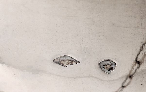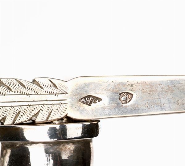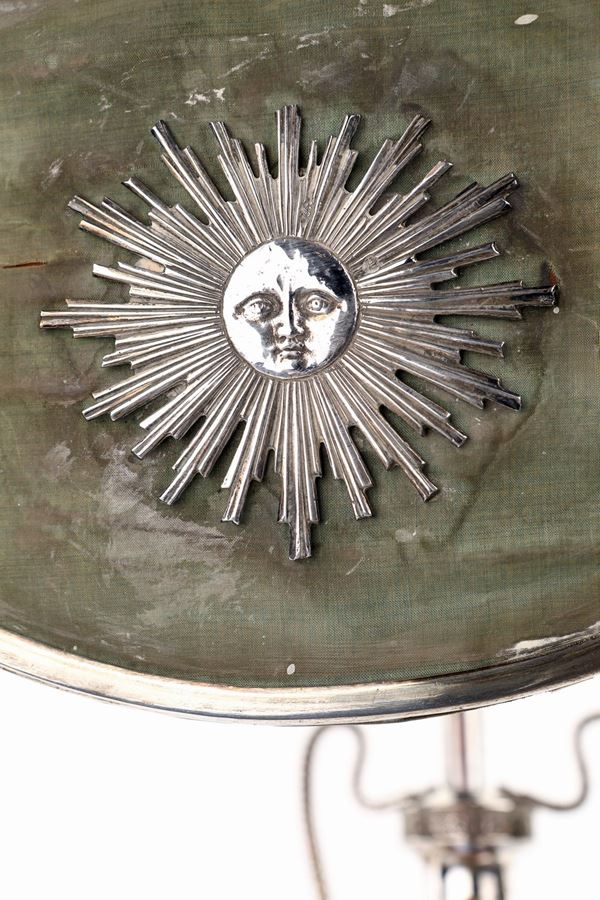 coppa portaolio a quattro beccucci sormontata da un vaso ad anfora biansata caratterizzato da lunghe foglie lanceolate incise, da cui si dipartono quattro catenelle con utensili per la cura della fiamma; ventola ovale decorata da una raggiera centrata da mascherone sbalzato a forma di sole; base circolare. Bollo camerale e del maestro argentiere ripetuti su ogni elemento