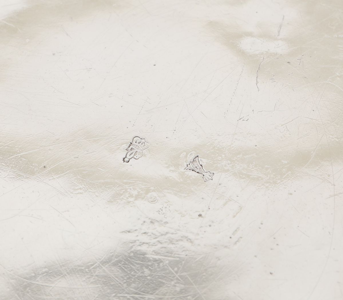 decorata da due stemmi con motto inciso "Sit Ordo in Omnibus" diametralmente opposti; presa in forma di frutto su raggiera fogliacea minuziosamente cesellata; manici con attacchi a forma di corolla