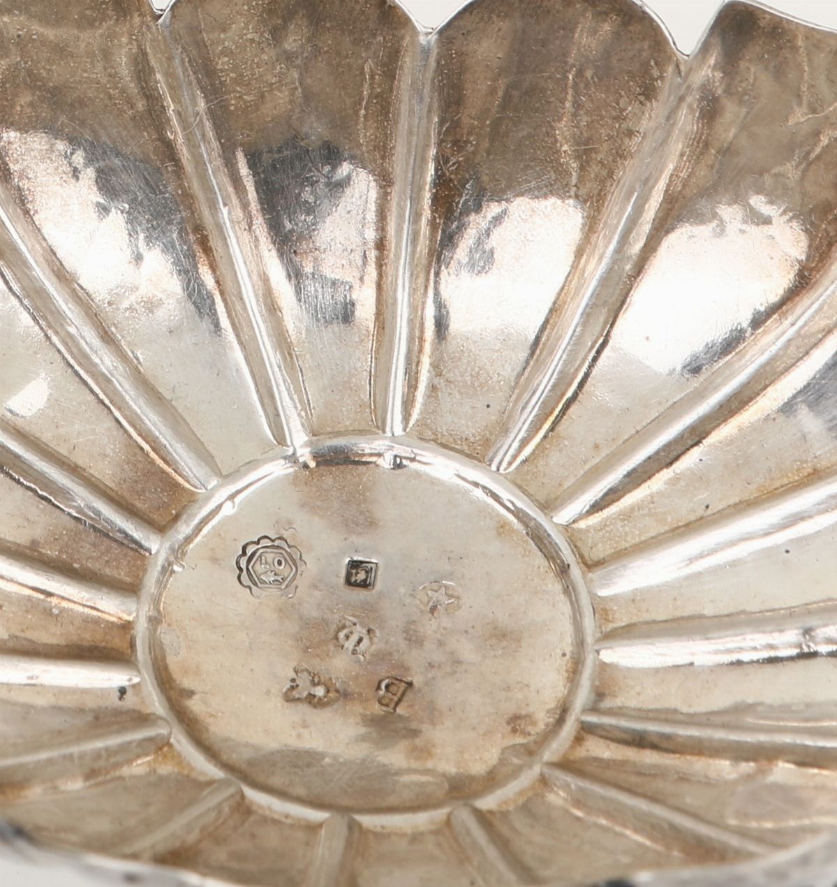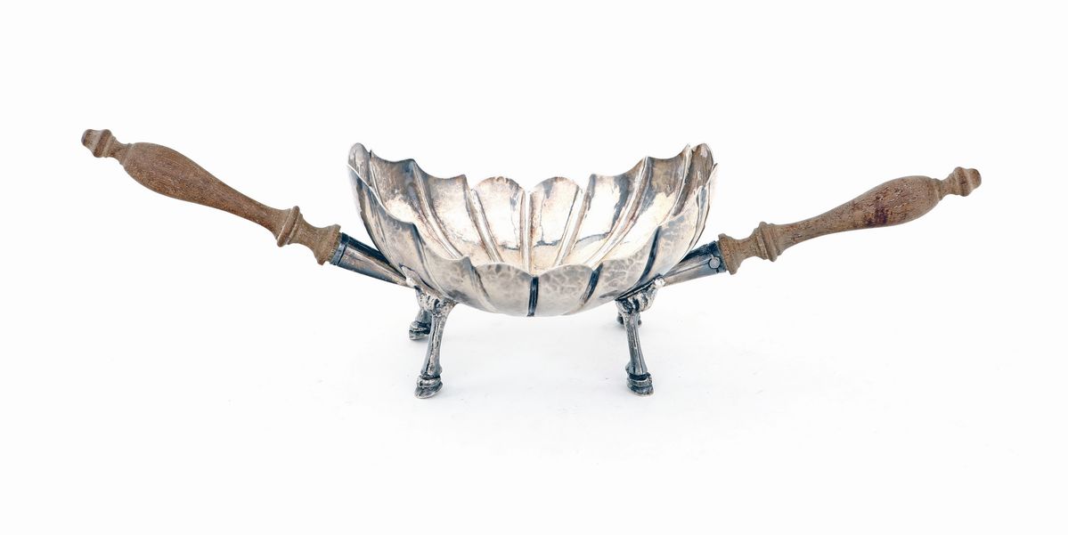 con corpo percorso da scanalature ed orlo superiore mistilineo, caratterizzata da manici in legno tornito e poggiante su quattro gambe con piedi a zoccolo