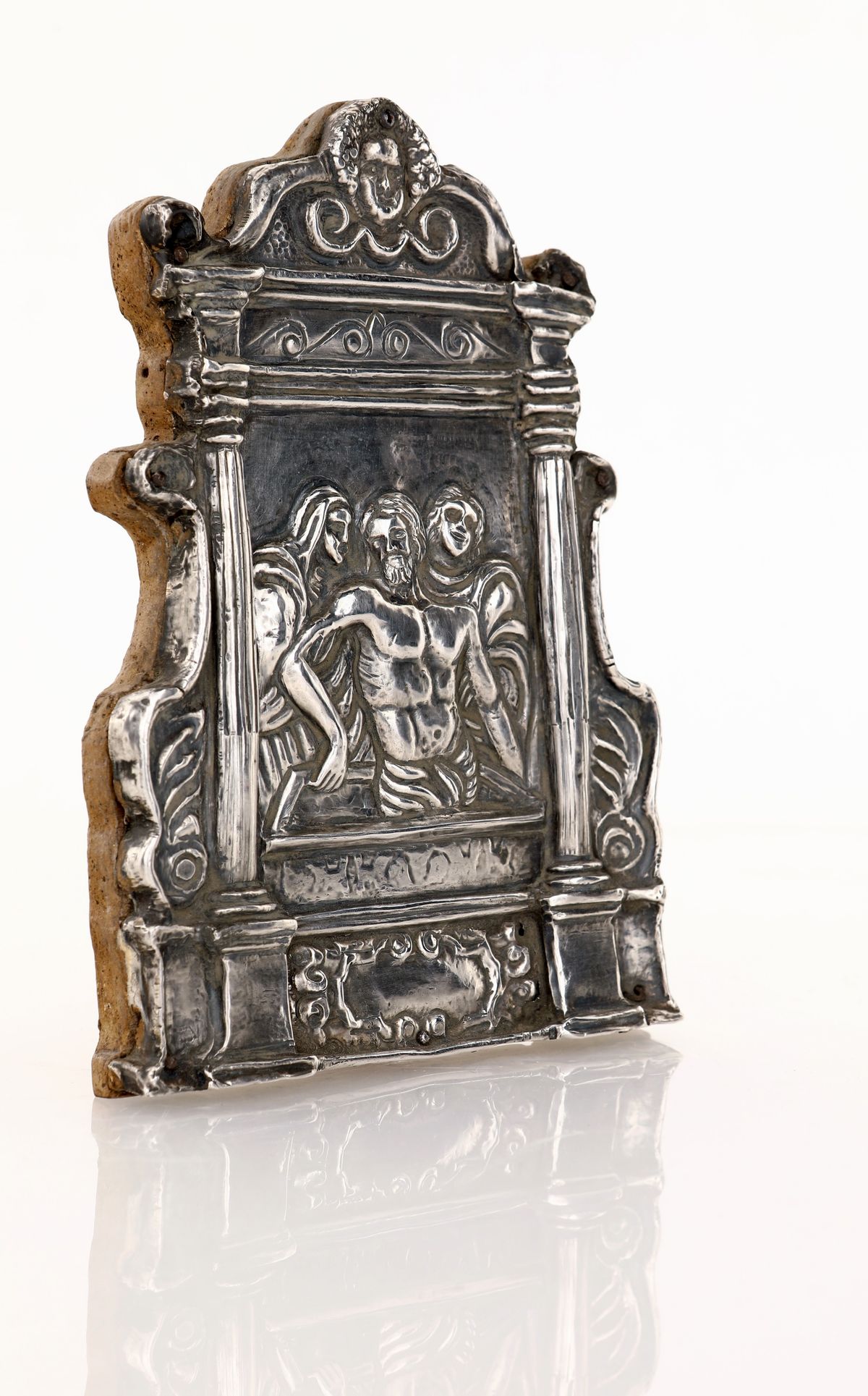 raffigurante "pietà" con la figura di Cristo entro il sepolcro, sorretto da San Giovanni a sinistra e dalla Vergine a destra racchiusi in un'edicola architettonica