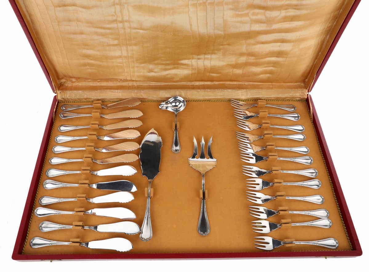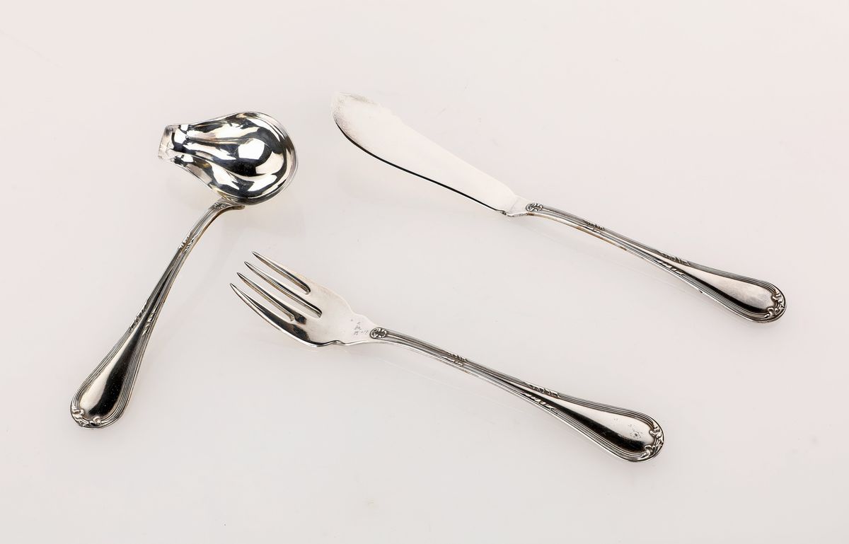 composto da dodici forchette ed altrettanto coltelli, due posate per servire ed un mestolo per la salsa; impugnature dal vertice arrotondato percorso da sottili nervature sormontate da rilievi vegetali sparsi
