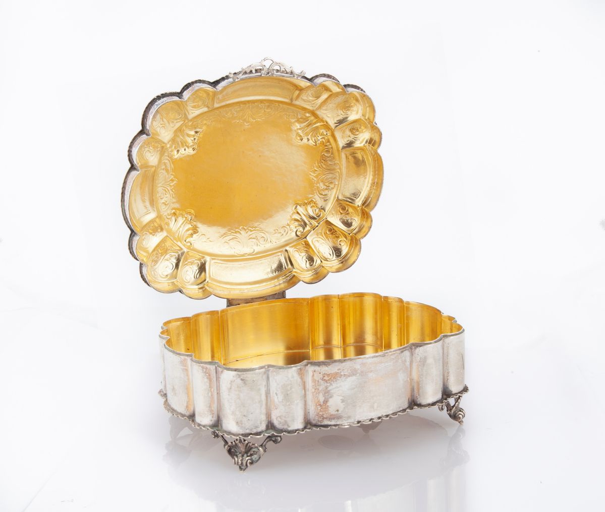 con interno dorato e coperchio incernierato dominato da gemma verde cabochon, decorato da volute e motivi vegetali incisi e sbalzati