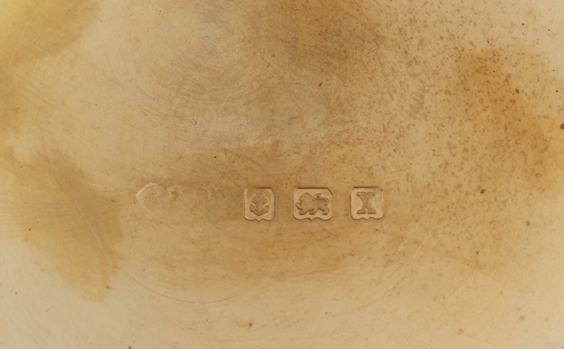 coperchio incernierato con tracce di decorazione rigata consunta, comprendente un contenitore per fiammiferi, accessibile tramite l'apertura di una porzione a mezza luna del coperchio; lungo la circonferenza, una parte dentata per l'accensione a sfregamento dei fiammiferi; interno dorato