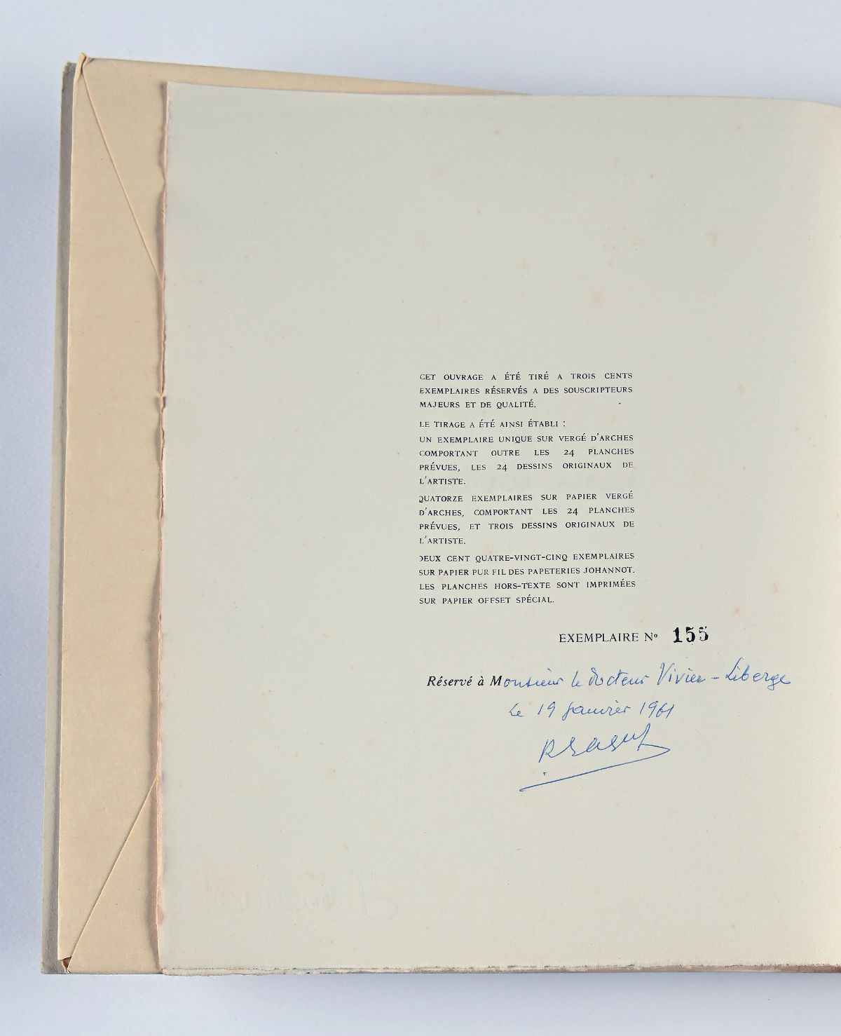 1 vol. mm. 290X230, pp. 228-[4]. Bross. ed. con titoli al piatto, carte libere. Edizione firmata da Roland Gagey e numerata ad personam (es. 155/300 per Vivier Liberge); testo a col. con iniz. fig. Cartella con titoli al dorso e cofanetto. Ottimo stato di conservazione. Include astuccio con 24 tav. ill.