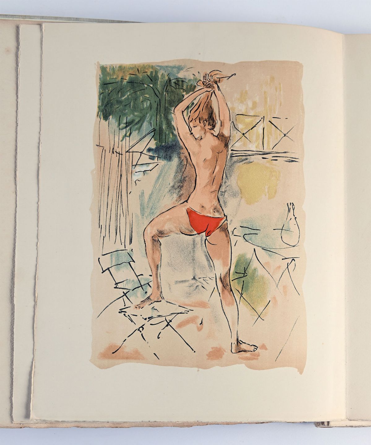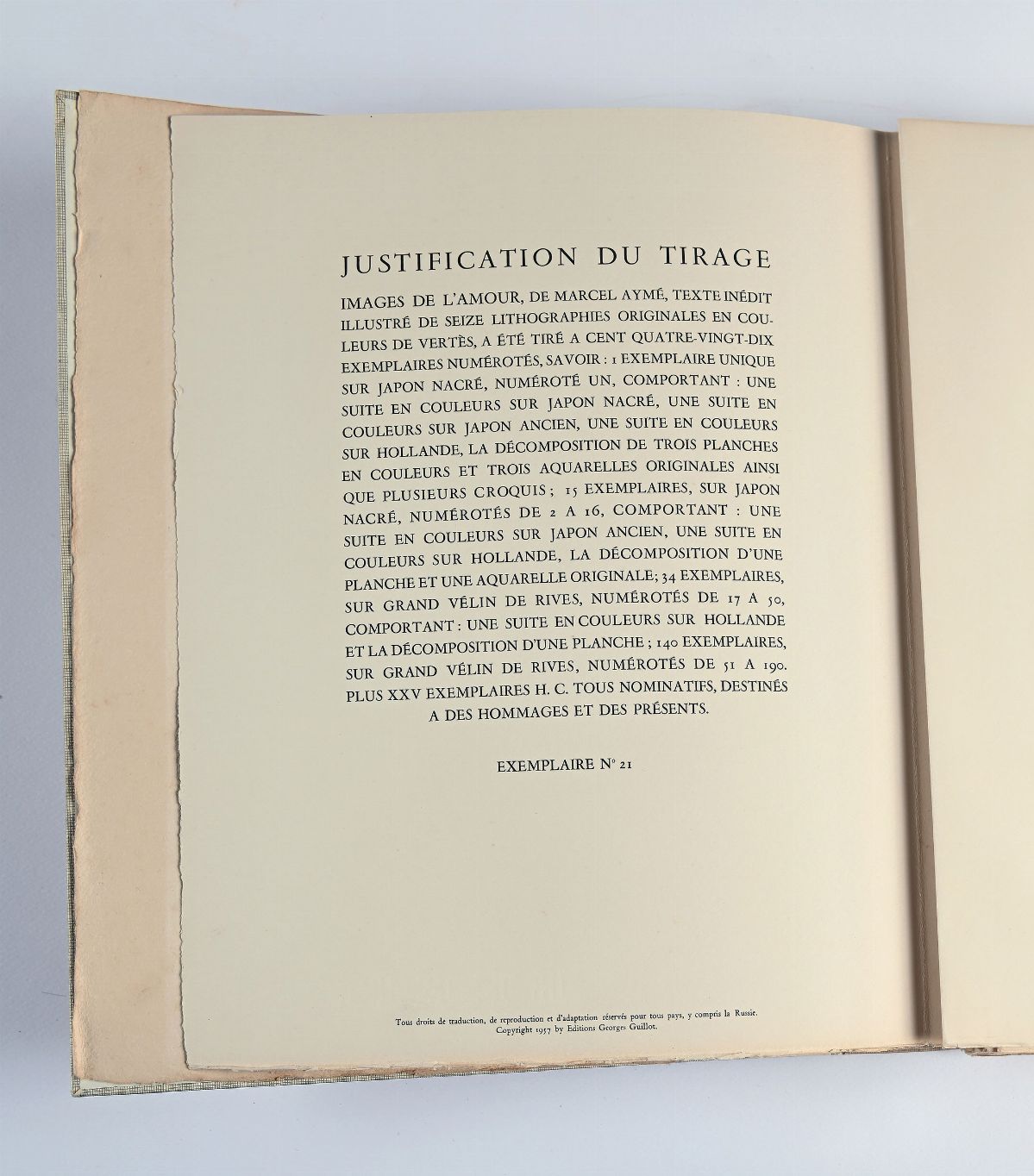 1 vol. Bross. ed. pp. 120, mm 335x265. Testo inedito illustrato con 16 litografie erotiche originali a colori nel testo; edizione di grande formato. Soli 190 esemplari numerati e firmati all’occh. da M. Aymé e Marcel Vertès, questo è il n. 21 (uno dei rarissimi 34 esemplari su carta Grand Vélin de Rives, con una suite di 23 tavole a colori su carta Holland e la scomposizione di una tavola).